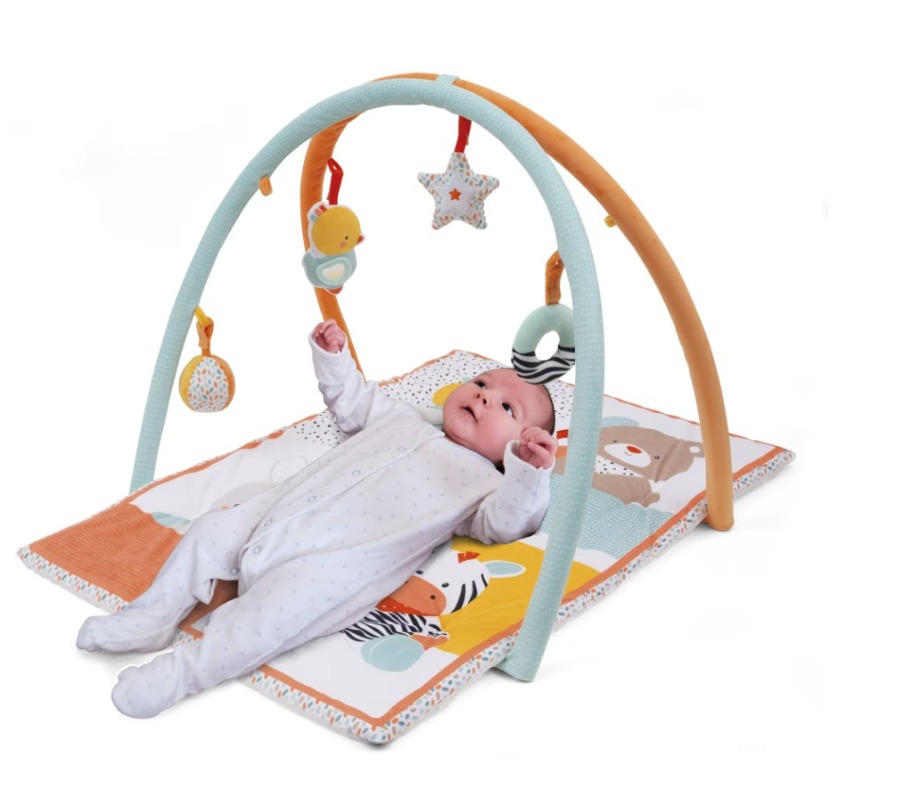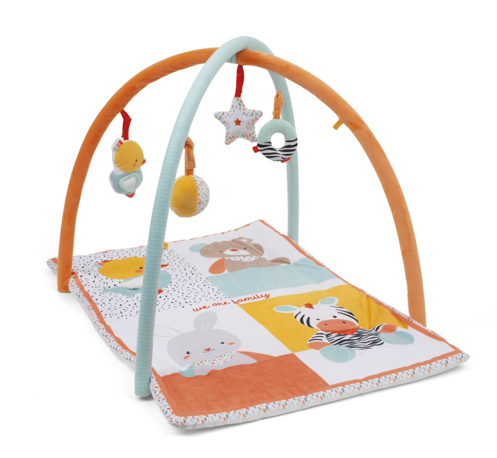 Խաղահրապարակ՝ փափուկ կտորից պատրաստված գորգով, ձեր երեխայի խաղի առաջին պահերի համար։ Հագեցած է երկու կամարներով, որոնք կարող են տեղադրվել երկու եղանակով՝ հավասարեցված կամ խաչաձև՝ տարբեր կարիքներին հարմարվելու համար։