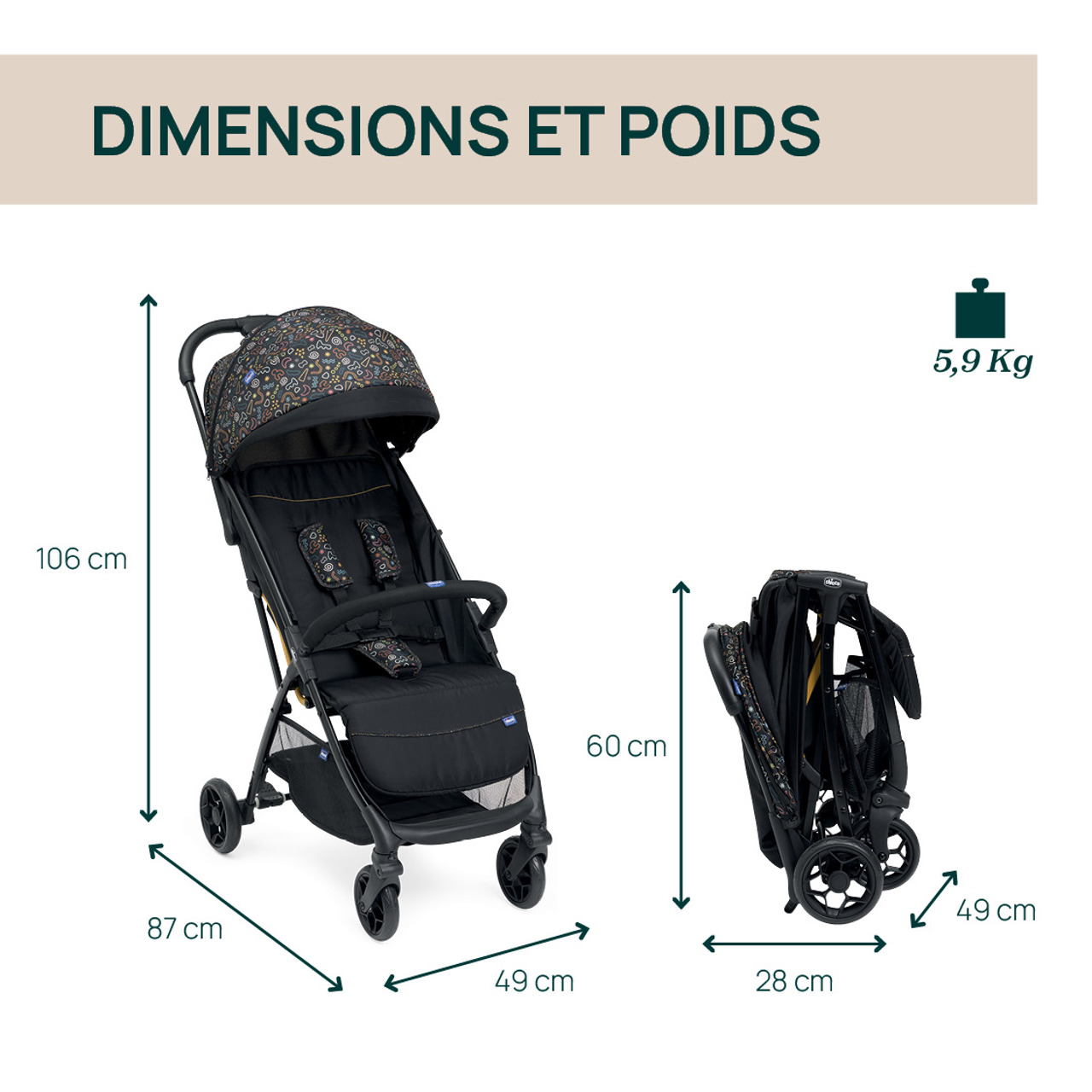 • ունի հարմարավետ հետևի բռնակ, ինչպես նաև կարգավորվող մեծ հովանոց՝ արևից ու քամուց պաշտպանելու համար,