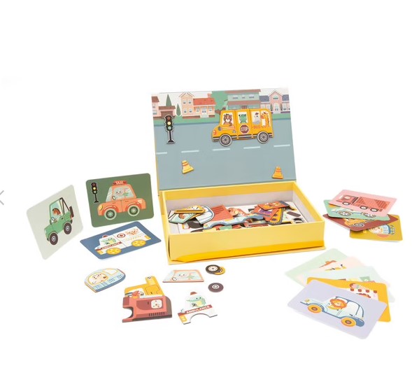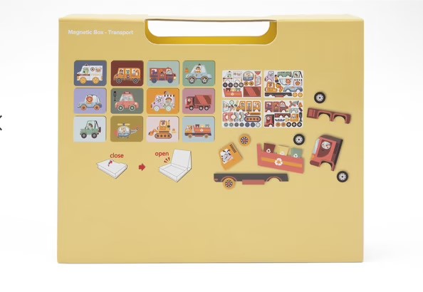 Խթանեք ձեր երեխայի ստեղծագործականությունն ու տրամաբանությունը «Քաղաքում գտնվող տրանսպորտային միջոցներ» մագնիսական պատյանի միջոցով։ Այս զվարճալի և գործնական խաղը հրավիրում է փոքրիկներին պատկերացնել, հավաքել և հորինել իրենց սեփական տրանսպորտային միջոցները։ Պայուսակը պարունակում է 10 նկարազարդ քարտեր ոգեշնչման համար և 62 մագնիսական կտորներ՝ մոդելները վերստեղծելու կամ քմահաճ տրանսպորտային միջոցներ ստեղծելու համար։ Կափարիչը վերածվում է մագնիսական տախտակի՝ ապահովելով իդեալական խաղահրապարակ ժամերով զվարճանալու համար։ Հեշտ է պահել իր առաձգական փակման և հարմարավետ բռնակի շնորհիվ, այս պատյանը կարող է տանել ամենուր՝ տանը կամ ճամփորդության ժամանակ։ Կատարյալ կրթական խաղալիք՝ նուրբ մոտորիկայի, կենտրոնացման և երևակայության զարգացման համար, միաժամանակ զվարճանալով քաղաքային արկածներ հորինելով։