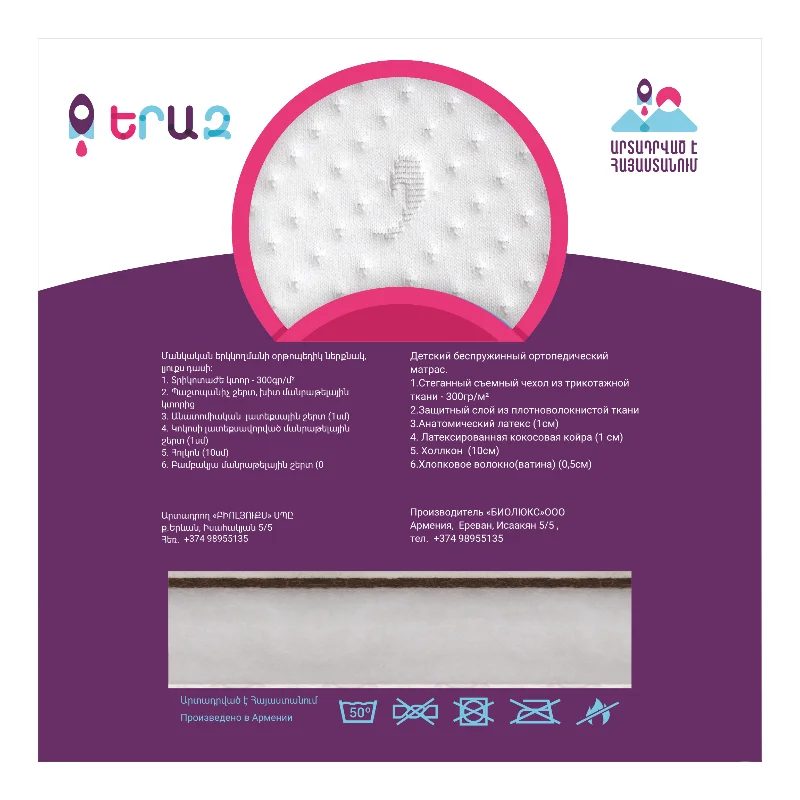 Ներքնակի վրայի շերտը կարելի է հանել և լվանալ 30° ջերմաստիճանում։