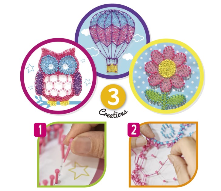 Ստեղծեք 3 գեղեցիկ դիզայն՝ օգտագործելով «Թելային արվեստի» տեխնիկան: Գունավոր թելեր հյուսեք ցցերի միջով՝ ստեղծելու գեղեցիկ նկարներ, որոնք կարող եք կախել ձեր սենյակում կամ նվիրել որպես նվեր: Հավաքածուն ներառում է ամեն ինչ, ինչ ձեզ անհրաժեշտ է՝ լար, պլաստիկ ցցեր, կպչուն թանկարժեք քարեր, հրահանգներ և 3 նախապես տպված նկարներ՝ ծաղիկ, օդապարիկ և բու, որոնք թույլ կտան ձեզ ստեղծել 3 արվեստի գործ:
