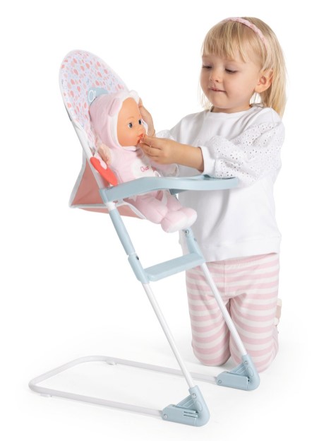 - Աթոռը հագեցած է լայն սկուտեղով՝ բաժակի համար նախատեսված տեղով, հարմարավետ ոտնահենակով և անվտանգության ամրագոտիներով։ Սա թույլ է տալիս տիկնիկին կամ փափուկ խաղալիքին անվտանգ նստել խաղալիս։